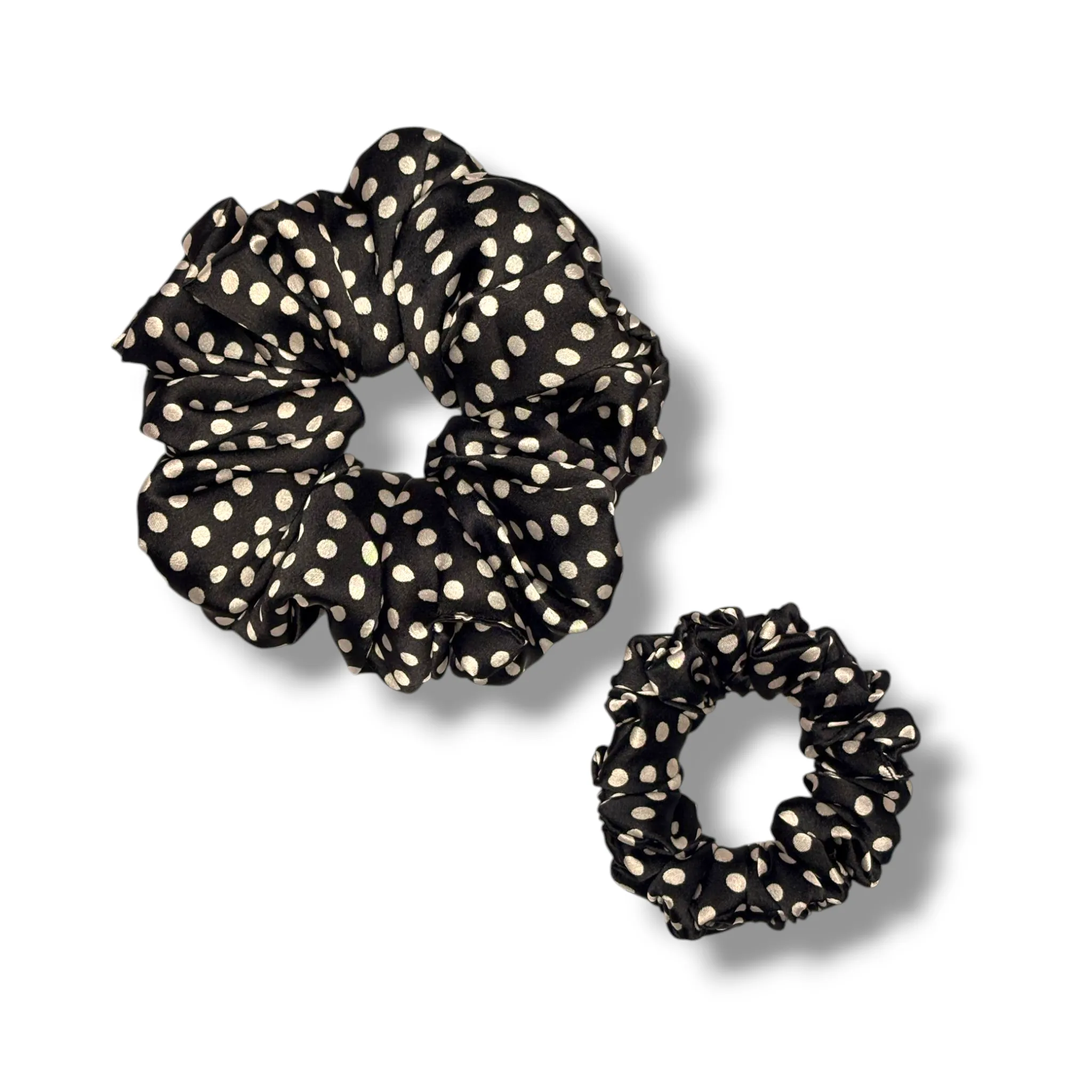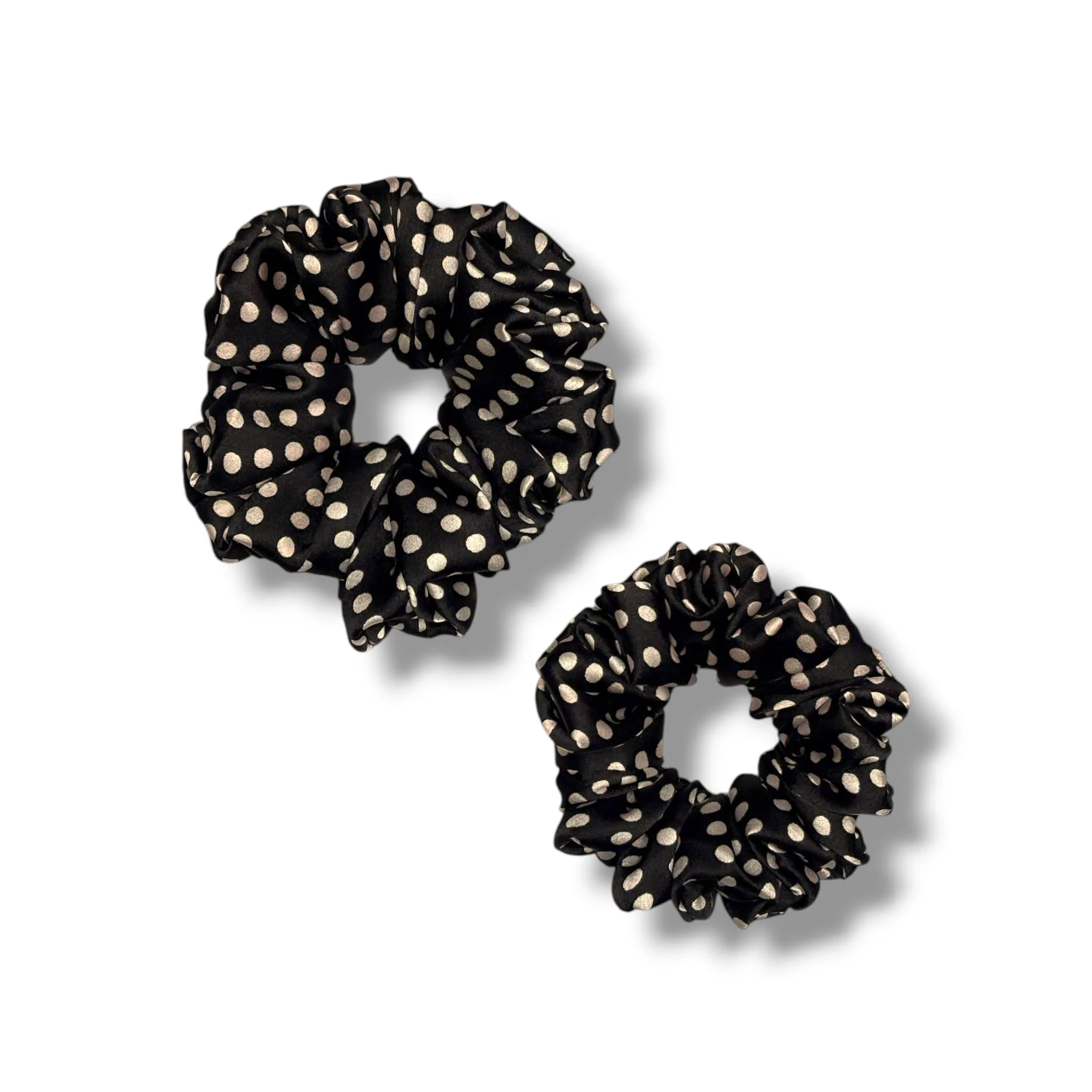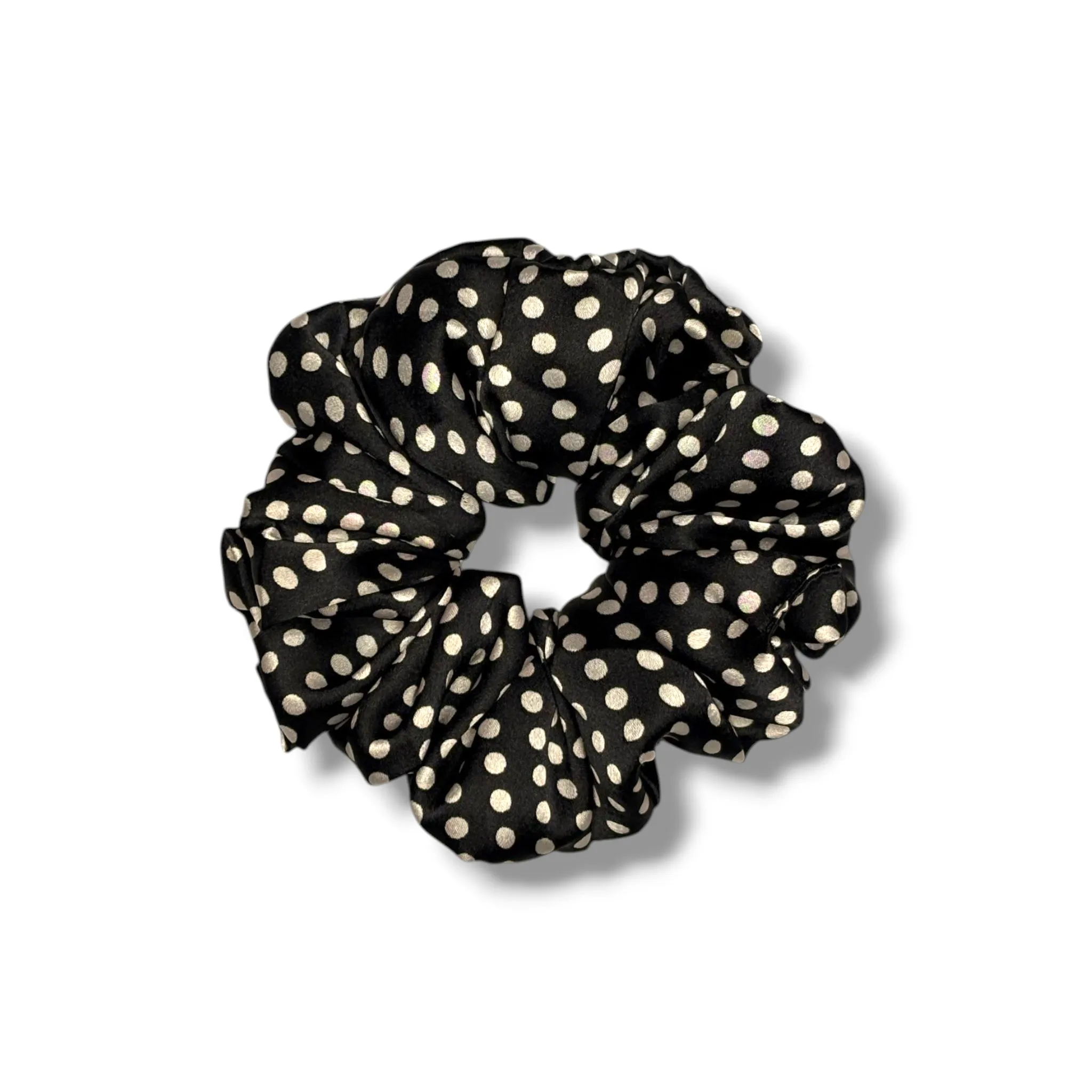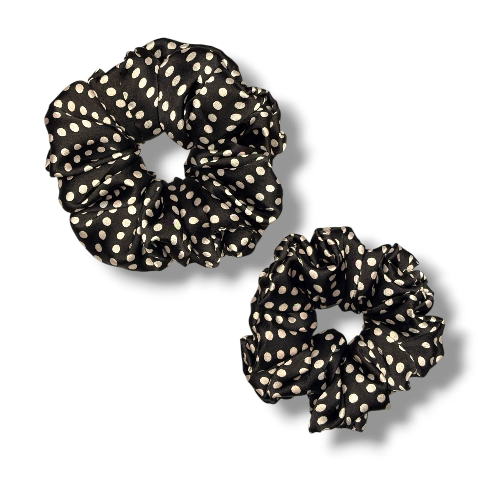 Classic Polka Perfection: The Black Polka Satin Scrunchie adds a timeless, elegant twist to any outfit with its chic white polka dots on a sleek black base.
