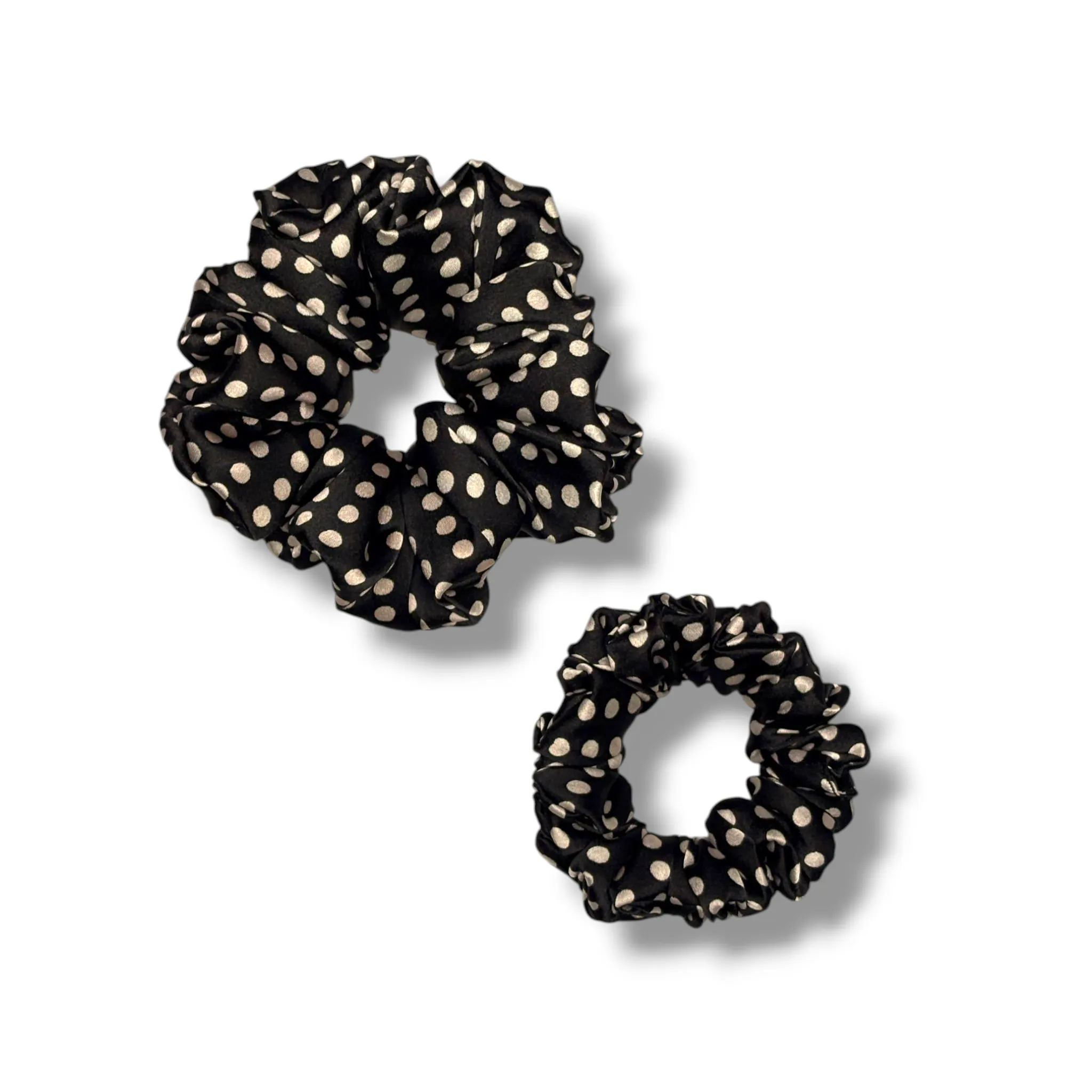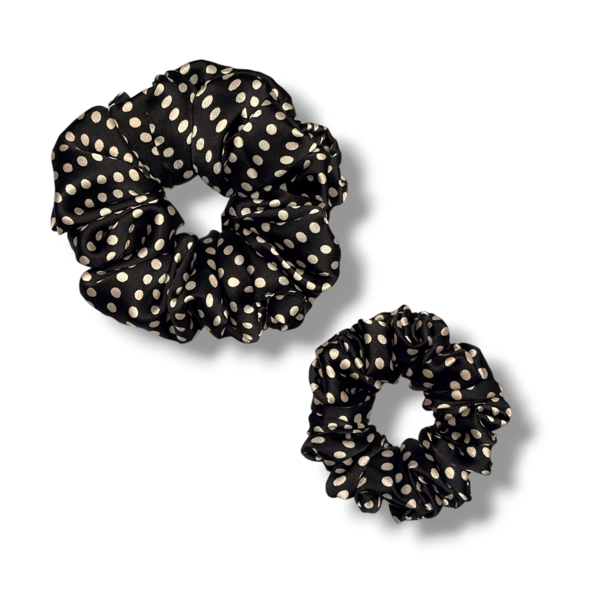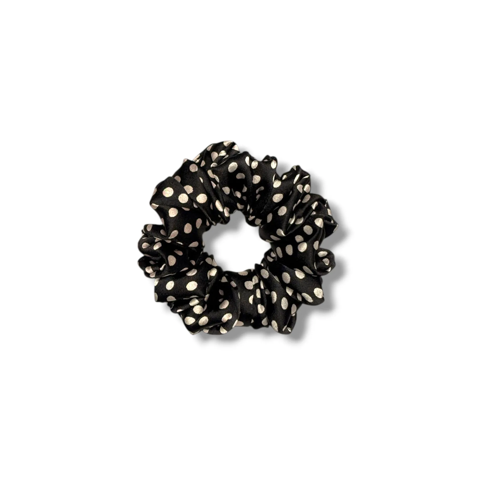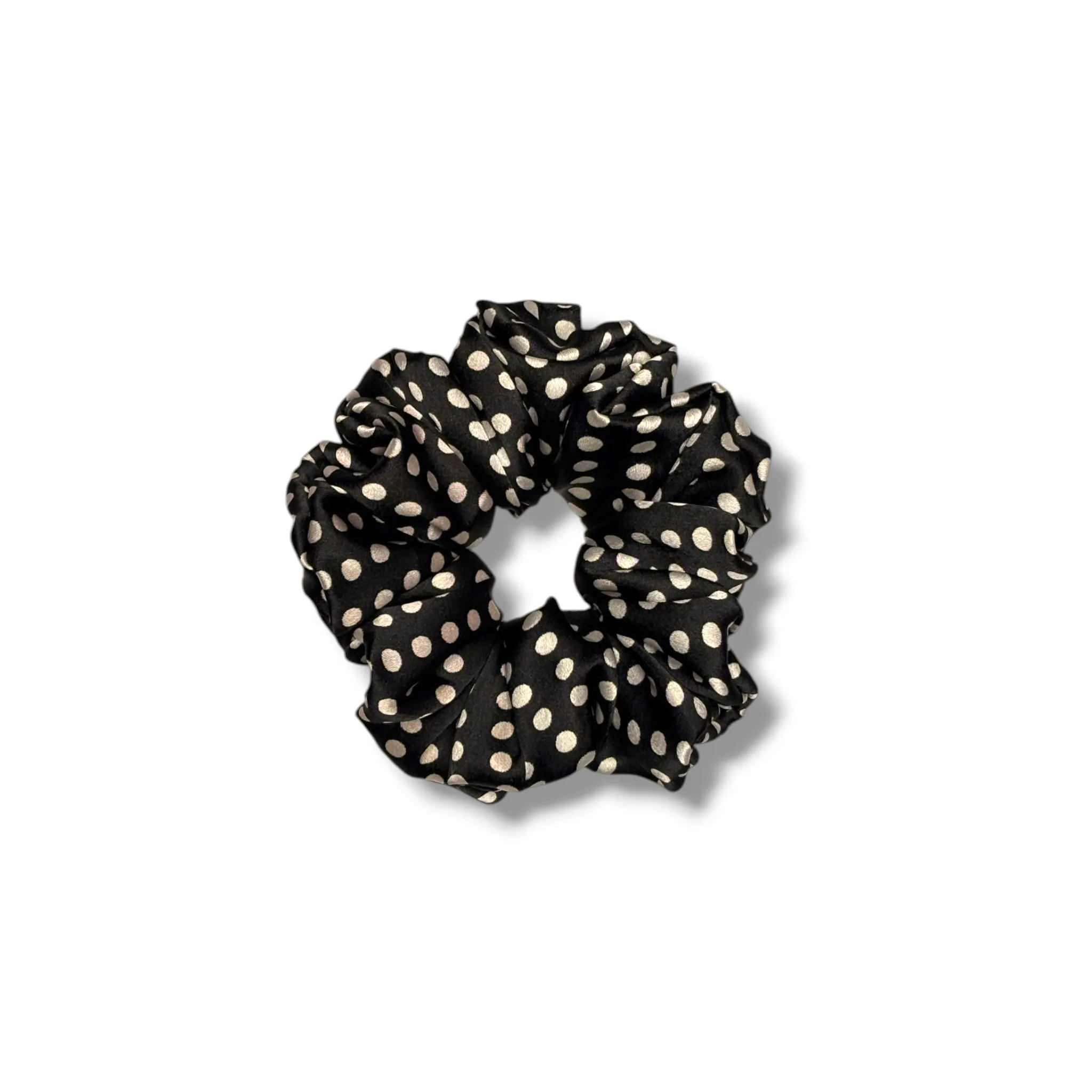Classic Polka Perfection: The Black Polka Satin Scrunchie adds a timeless, elegant twist to any outfit with its chic white polka dots on a sleek black base.