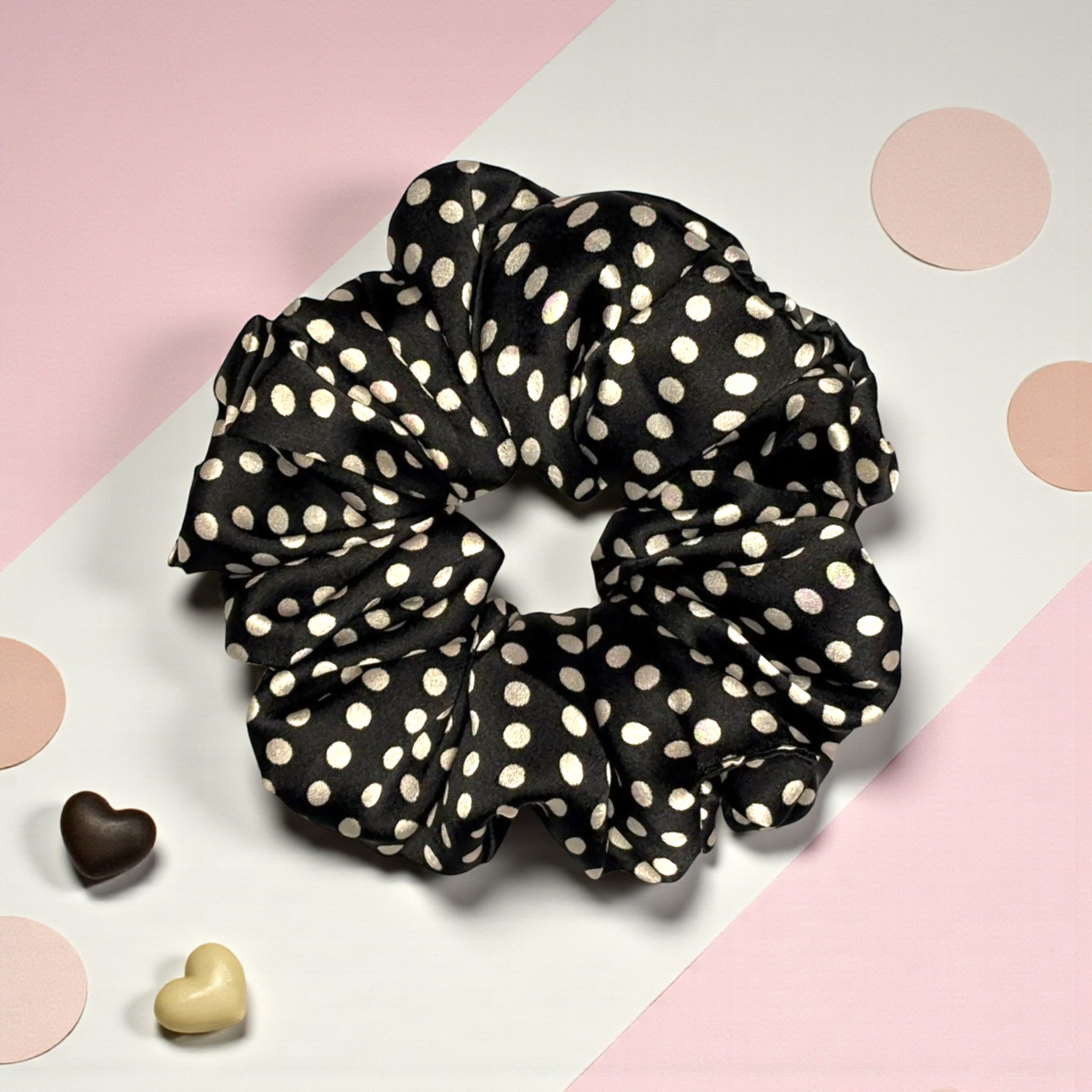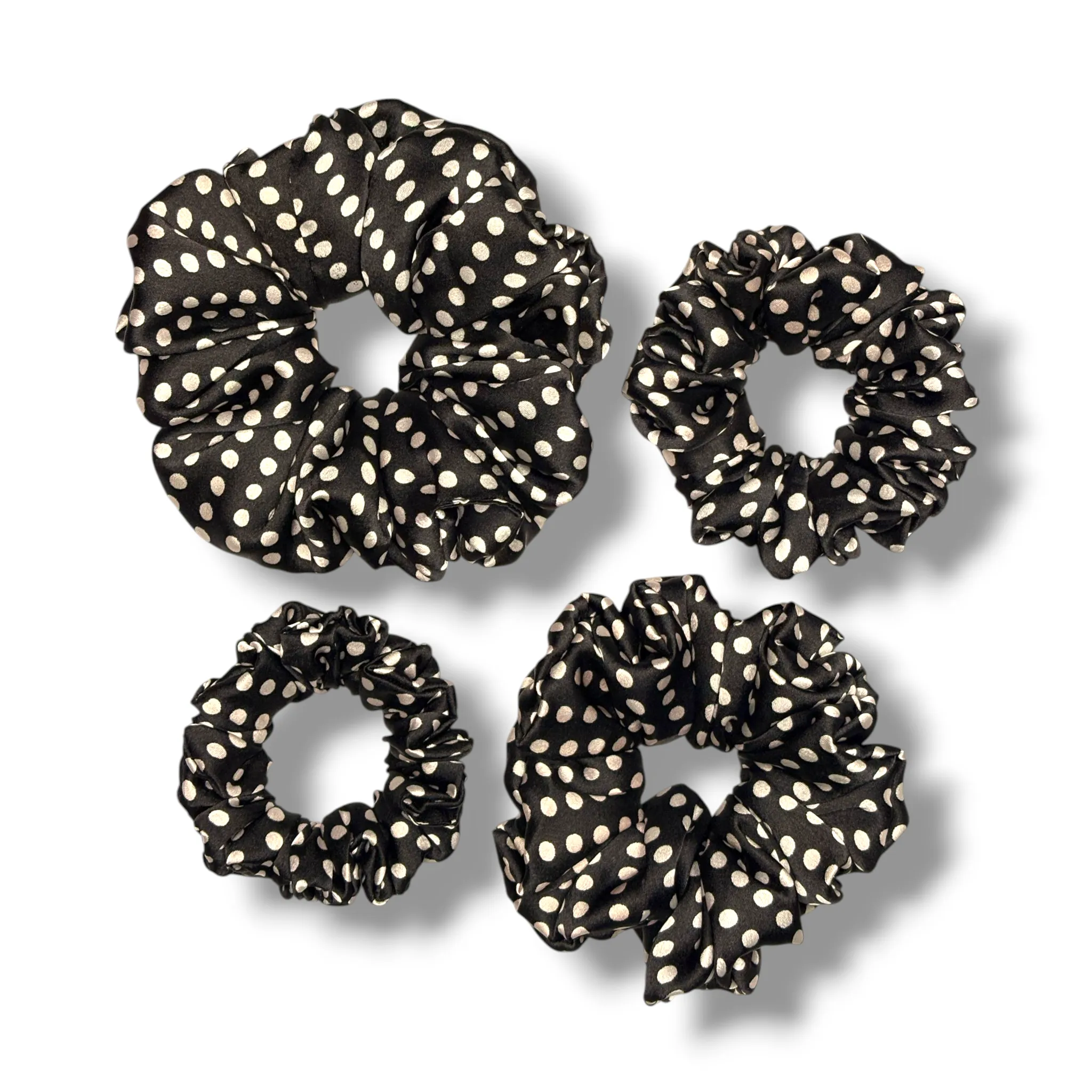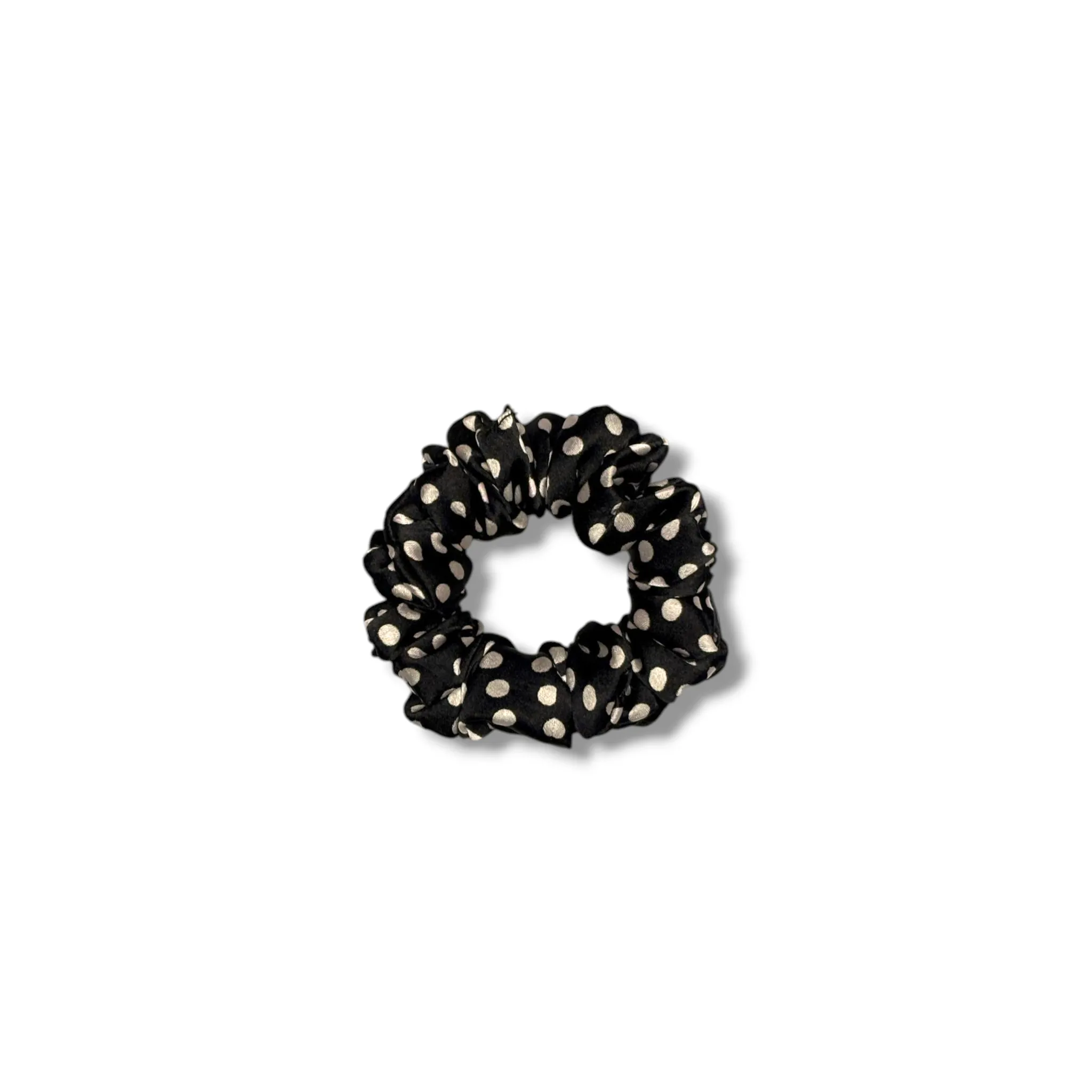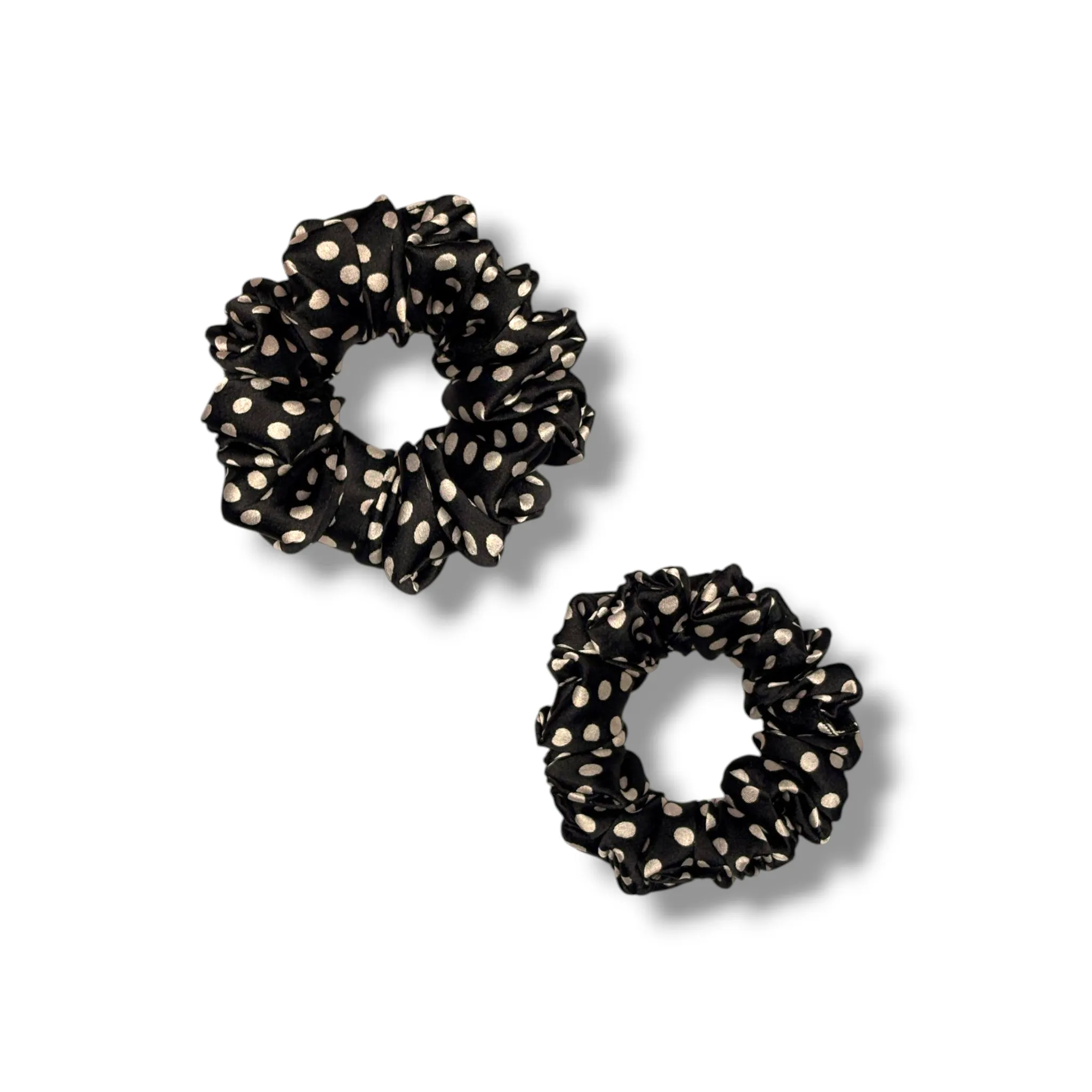 Classic Polka Perfection: The Black Polka Satin Scrunchie adds a timeless, elegant twist to any outfit with its chic white polka dots on a sleek black base.