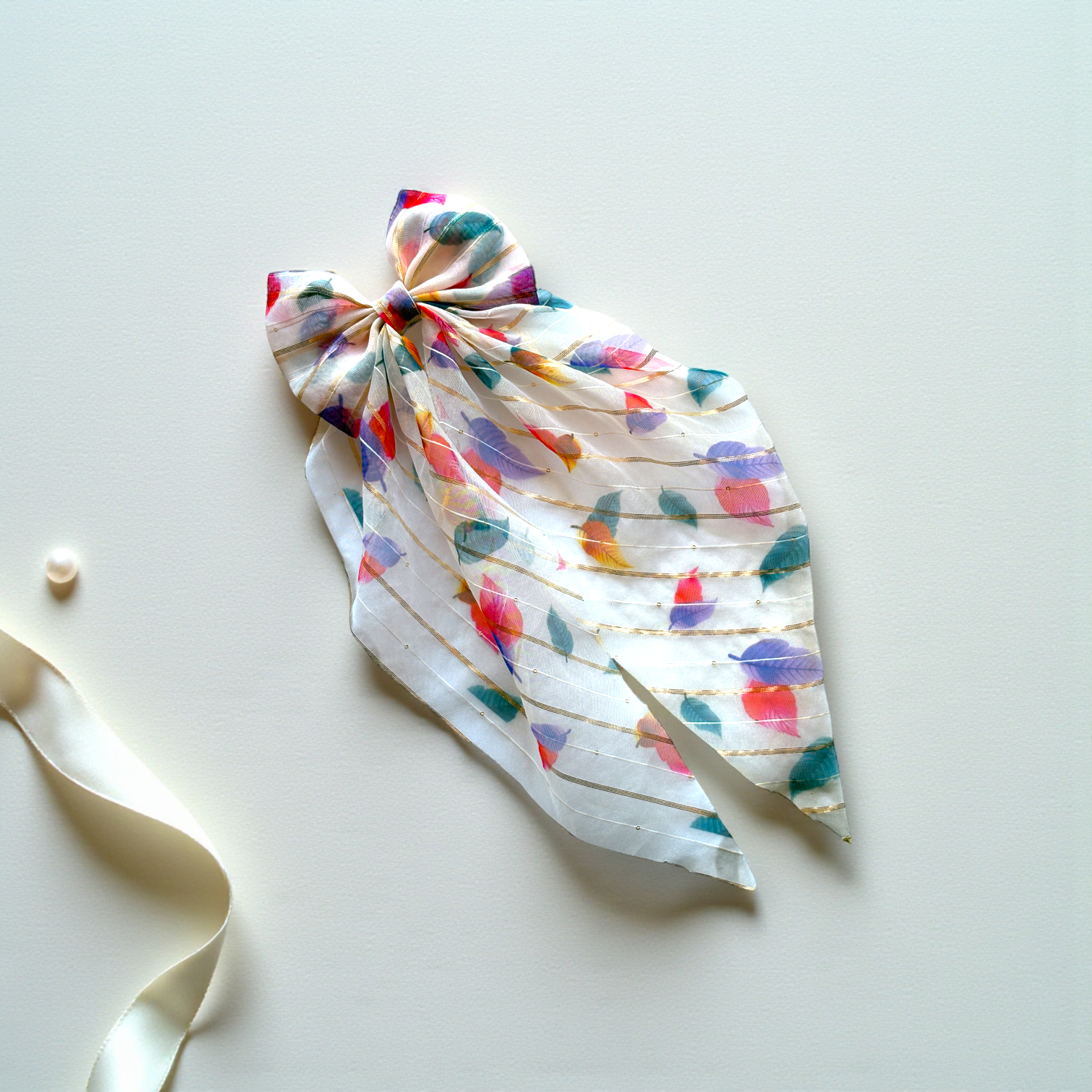 Every detail of the Ethereal Leaf Tail Bow speaks volumes about its artistry. The pastel hues are carefully chosen to blend seamlessly with a variety of outfits, while the gold lining adds a subtle shimmer that catches the light beautifully. The bow is designed to be versatile, making it suitable for various hairstyles and occasions. Whether you want to elevate a simple look or add a finishing touch to an elaborate outfit, this bow is your perfect partner for effortless style.