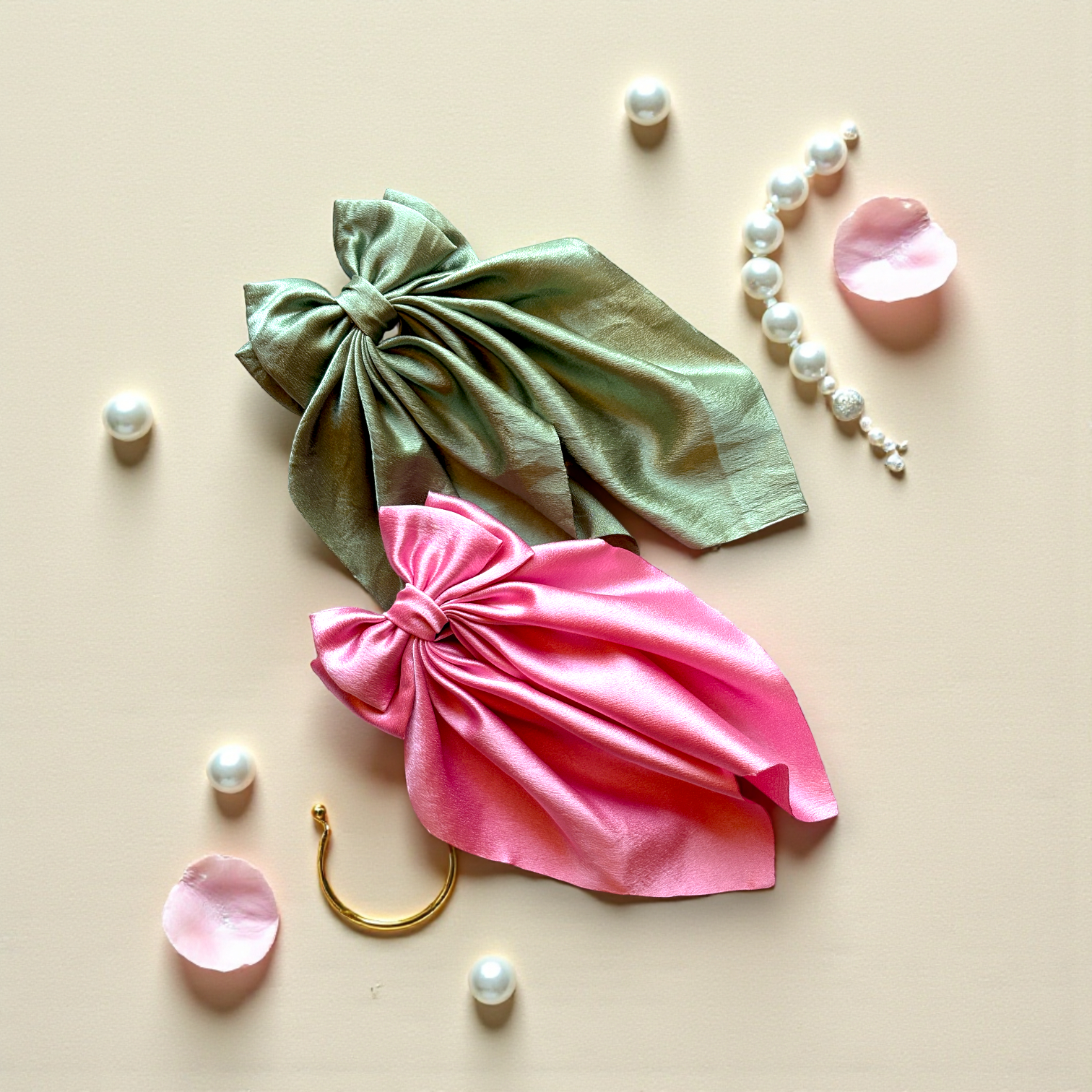 This set features two satin double bows, one in a calming olive green and the other in a bright, feminine pink. Together, they create a balanced mix of earthy and playful tones for versatile styling.