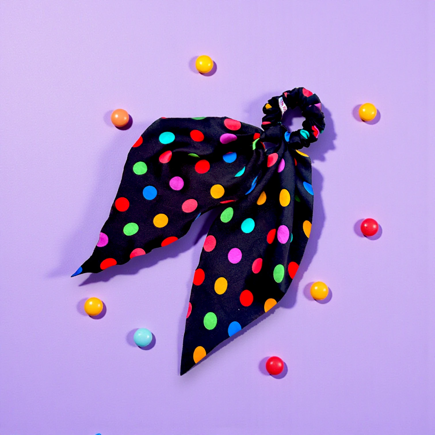 Bring playful sophistication to your collection with this Rainbow Polka Scarf Scrunchie and enjoy the versatility it offers in complementing different outfits. Add it to your wardrobe today for an accessory that’s both trendy and timeless!