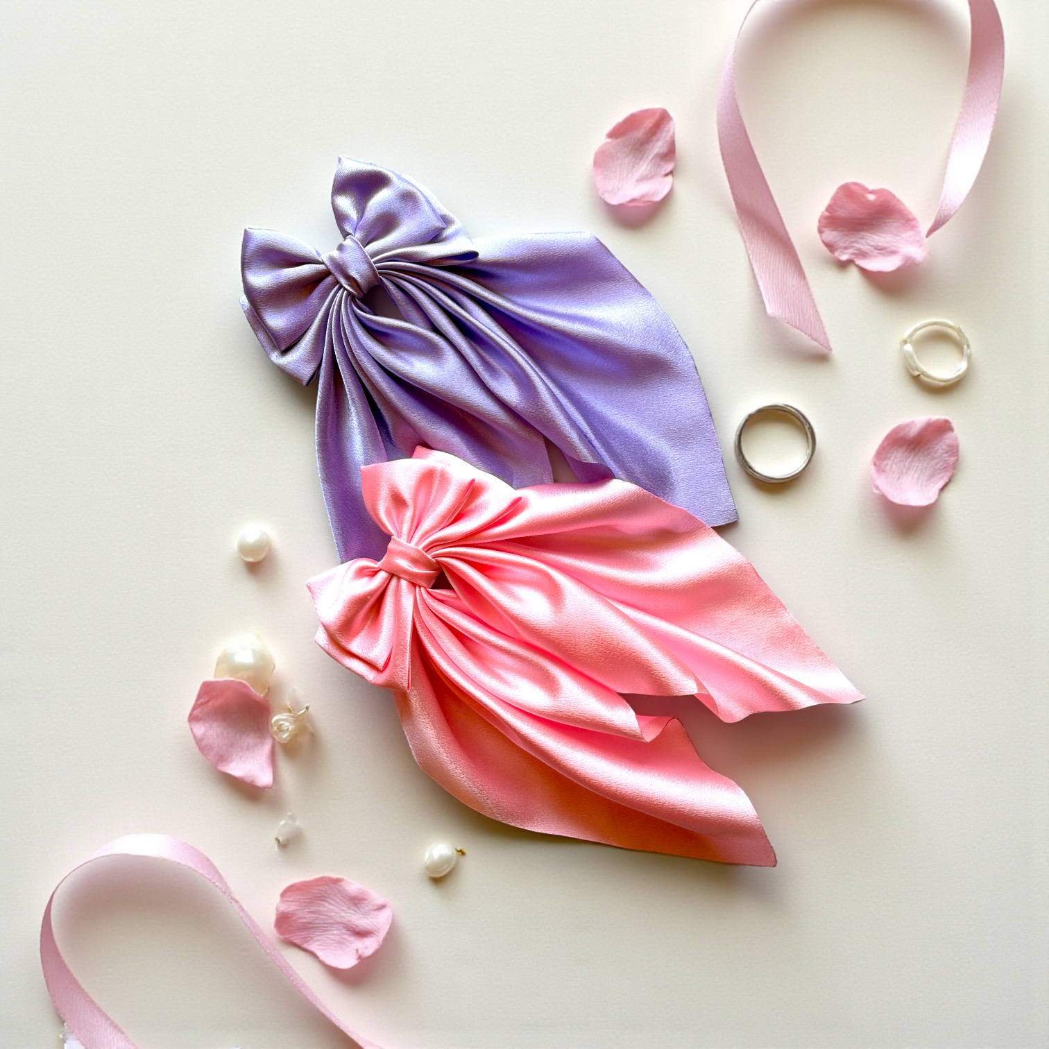 The Rose Satin Double-Bow Set stands out with its high-quality satin material that combines durability with a luxurious texture. Both bows feature long flowing tails that evoke a graceful silhouette, perfect for complementing various hairstyles and outfits. The soft Rose bow radiates warmth and femininity, while the glossy lilac bow introduces a sophisticated sheen to the ensemble. This pairing is ideal for those seeking elegance with a modern, versatile twist that suits weddings, parties, or casual outings.