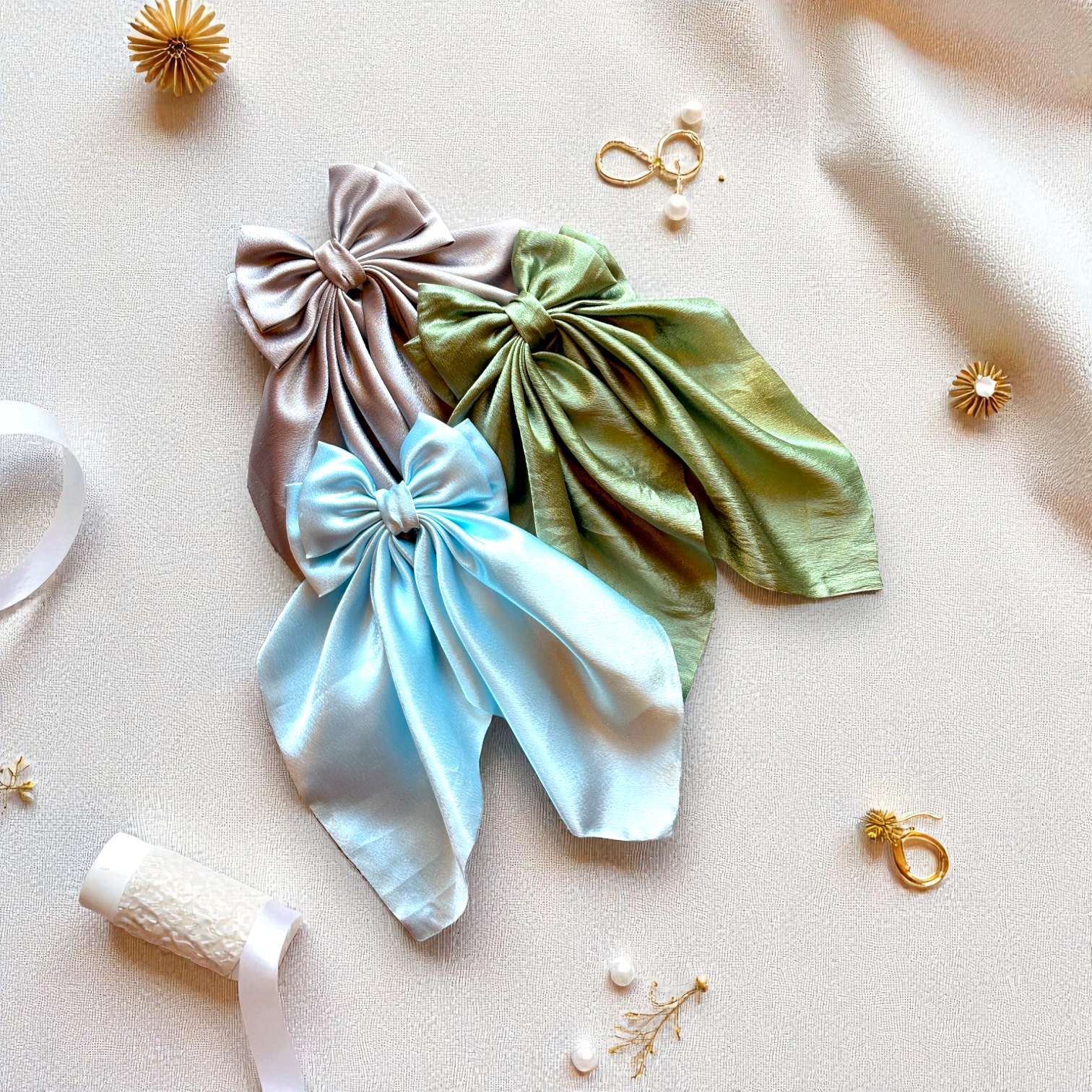 Elevate your hairstyle effortlessly with our Trio Double Bow Pack. Carefully crafted for those who seek elegance and versatility, this set features three exquisite double bows, each designed with glossy satin fabric in mocha, olive, and blue hues. The flowing tails and hand-tied finish make these bows a timeless addition to your hair accessory collection. Whether worn individually or paired together, they add sophistication to any outfit, making them perfect for casual outings or special events.